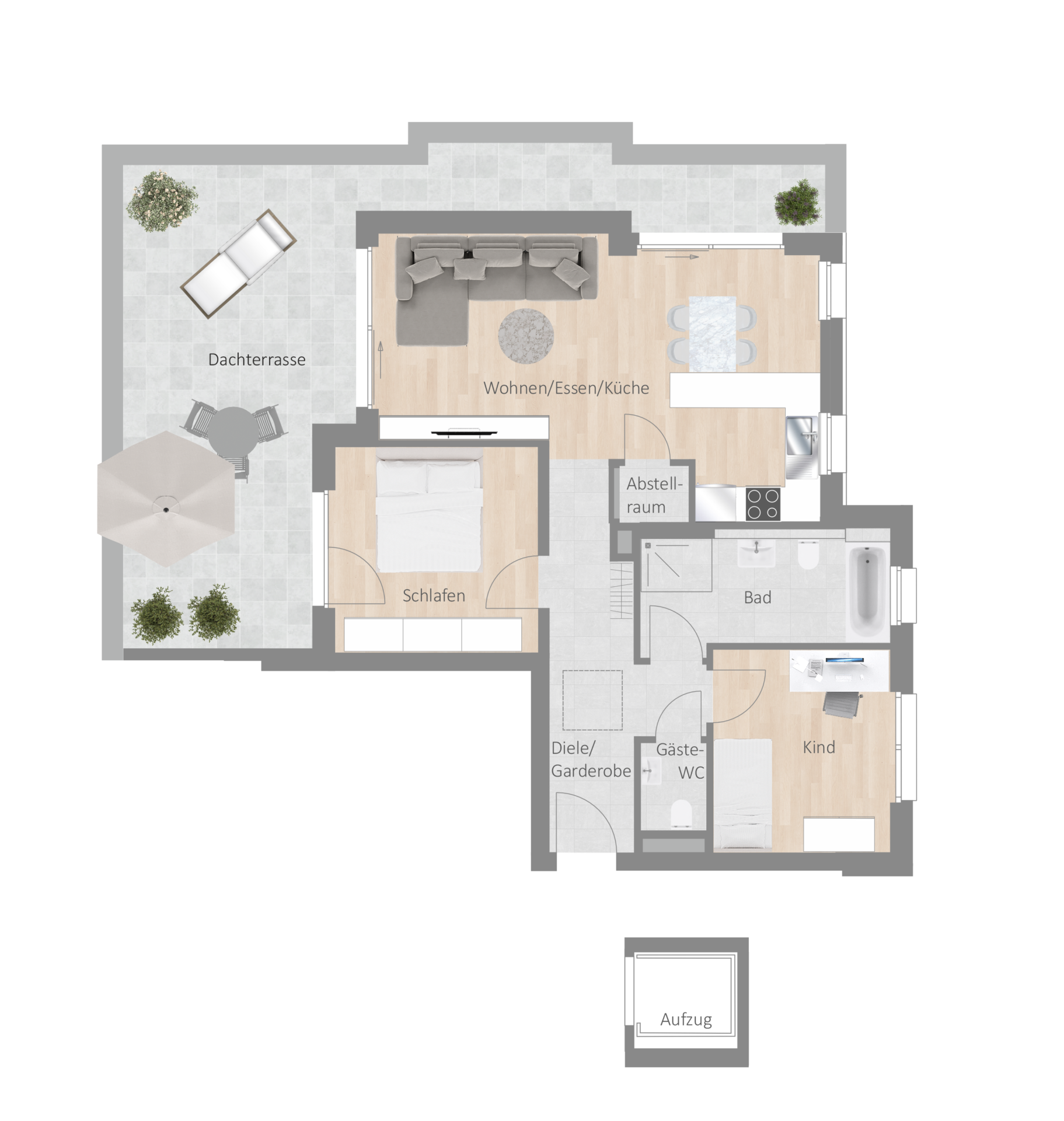 Das exklusive 3,5-Zimmer-Penthouse begeistert mit urbanem Komfort und hochwertiger Ausstattung. Der offen gestaltete Wohn-Essbereich mit integrierter Küche bietet viel Platz zum Entspannen, Kochen und Genießen – begleitet vom Tageslicht, das durch die großen Fensterfronten strömt. Highlight der Wohnung ist die beeindruckende Dachterrasse mit Weitblick – ideal für sonnige Nachmittage oder Dinner mit Freunden am Abend. Zwei Schlafzimmer – eines davon ideal als Kinder-, Gäste- oder Arbeitszimmer nutzbar – sowie ein großzügiges Tageslichtbad mit Badewanne und bodenebener Dusche bieten viel Raum für persönliche Rückzugsorte. Ein praktischer Abstellraum und eine großzügig geschnittene Diele mit stilvoll integrierter Garderobennische sorgen für Ordnung und ein aufgeräumtes Wohngefühl. Das separates Gäste-WC bietet zusätzlichen Wohnkomfort. Der Aufzug bringt Sie bequem von der Tiefgarage bis vor Ihre Wohnungstür – barrierearm und komfortabel. (Penthouse 11B)