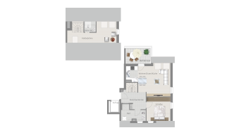 Attraktiv und Exklusiv – großzügiges Loft auf zwei Ebenen Das hochwertig konzipierte Loft verbindet Großzügigkeit mit moderner Raumarchitektur. Der offen gestaltete Wohn-Essbereich mit Loggia und angrenzender Küche bildet das stilvolle Herzstück der unteren Etage. Ein weiteres Zimmer, ein Tageslichtbad mit bodenebener Dusche und der Abstellraum runden das Raumangebot funktional ab. Im Obergeschoss erwartet Sie ein privater Rückzugsbereich mit zwei Schlafzimmern und einem eleganten Bad. Der gut durchdachte Grundriss schafft ein Wohngefühl der besonderen Art – perfekt für alle, die Wert auf Raum und Raffinesse legen. (Wohnung 9C)