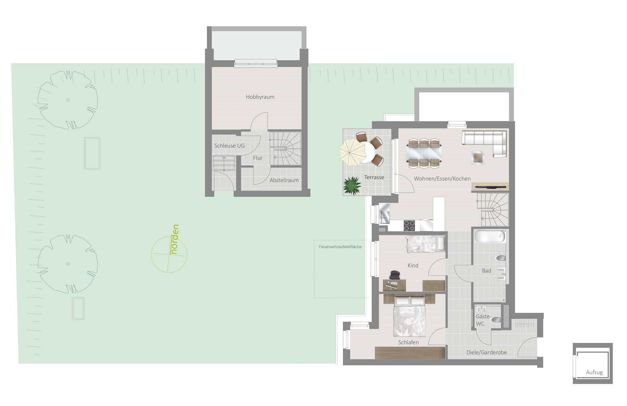 Viel Platz für Familie und Komfort Der durchdachte Grundriss bietet ein ideales Zuhause: Ein großzügiger Wohn-Ess-Kochbereich mit Zugang zur Süd/West-Terrasse und Garten lädt zum gemeinsamen Leben und Entspannen ein. Zwei helle Schlafzimmer mit Blick ins Grüne schaffen ideale Rückzugsorte. Ein modernes Bad mit bodenebener Dusche und Badewanne, ein zusätzliches Gäste-WC, ein praktischer Abstellraum, die Diele mit Garderobe, ein Aufzug bis vor die Wohnungstür und Hausmeisterservice runden das Angebot ab. (NØVA I Wohnung 3A)