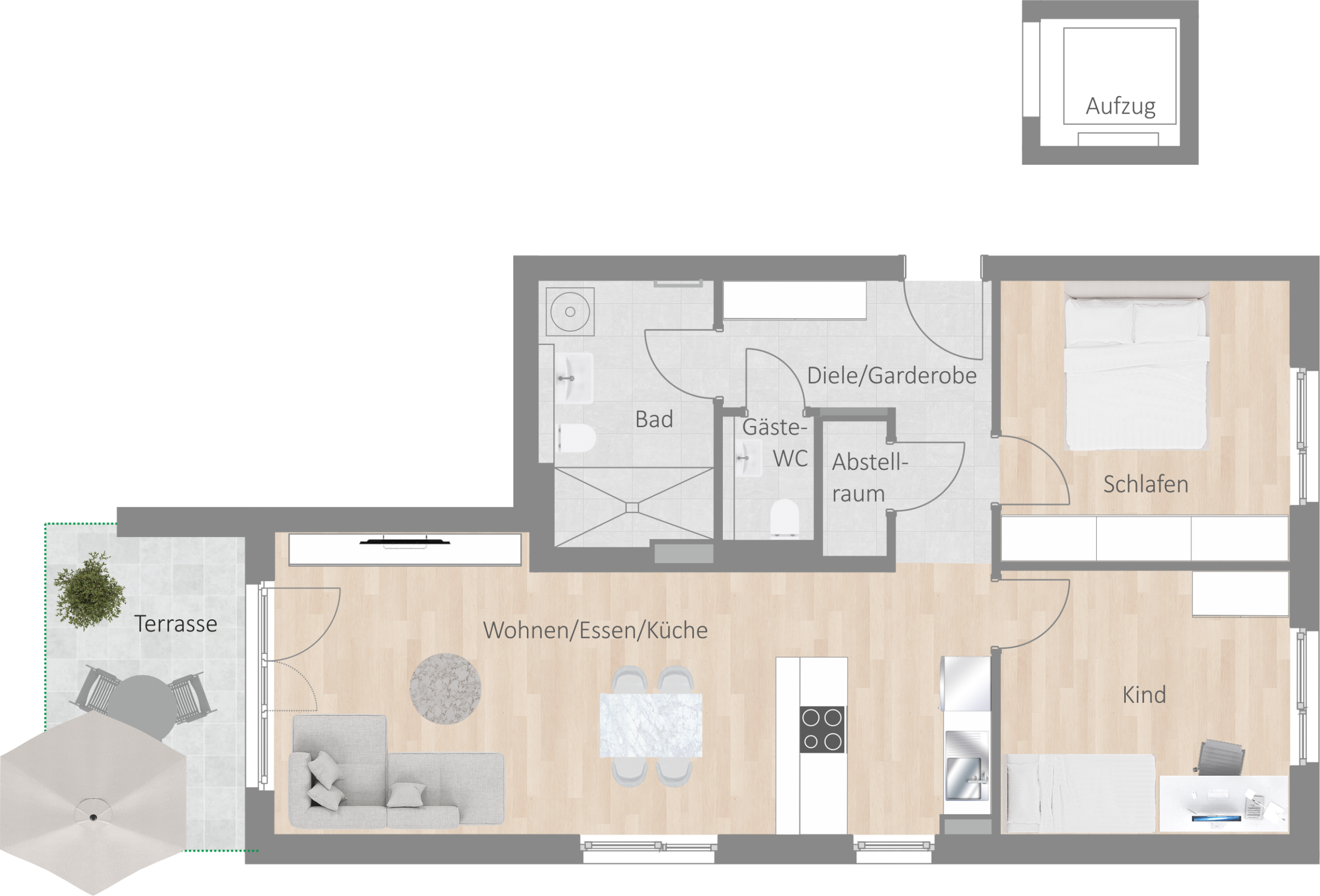 Mehr Zuhause. Ihr Garten wartet schon. Diese charmante 3,5-Zimmer-Terrassenwohnung überzeugt mit einem gut durchdachten Grundriss, hellen Räumen und einem modernen Wohnkonzept. Auf rund 81 m² Wohnfläche genießen Sie großzügigen Wohnkomfort – perfekt für Singles, Paare oder kleine Familien. Der offen gestaltete Wohn-/Ess-/Kochbereich schafft ein einladendes Ambiente und gewährt direkten Zugang zur sonnigen Terrasse mit Garten – ein idealer Ort zum Entspannen und Verweilen. Zwei Schlafzimmer bieten vielseitige Nutzungsmöglichkeiten, sei es als Kinderzimmer, Büro oder Gästezimmer. Ein stilvolles Tageslichtbad sowie ein separates Gäste-WC sorgen für zusätzlichen Komfort im Alltag. Ein praktischer Abstellraum und die Garderobennische runden das Raumangebot ab. Der Aufzug bringt Sie bequem bis vor die Wohnungstür – ein Zuhause mit Zukunftsperspektive. (Wohnung 3C)