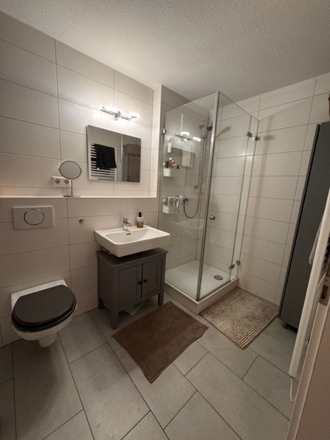 Stufenfreier Zugang von der Tiefgarage, großes Bad mit WC, bodenebener Dusche, Badewanne sowie Waschmaschinenanschluss. Zusätzliches Gäste-WC mit Dusche.